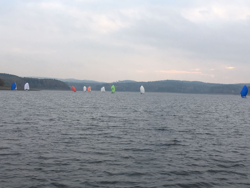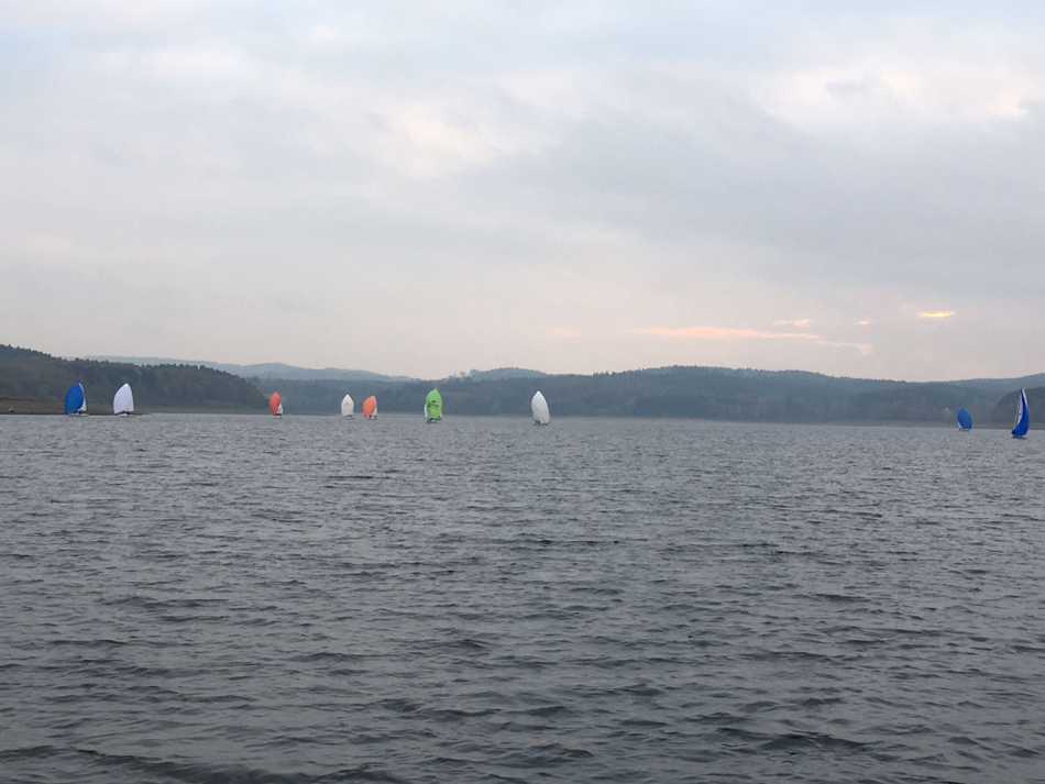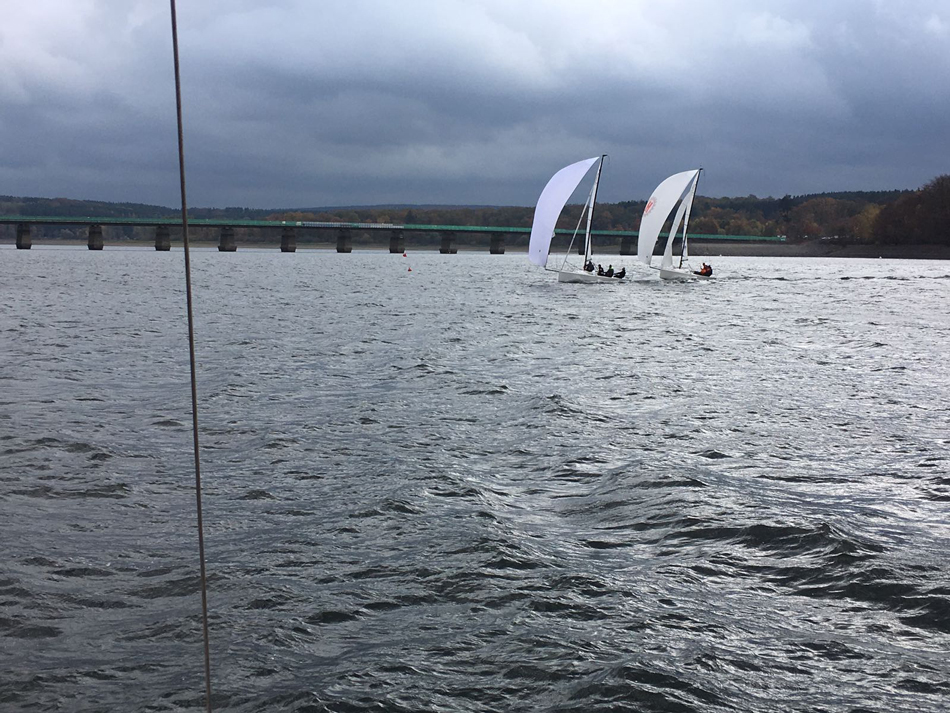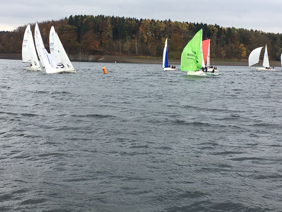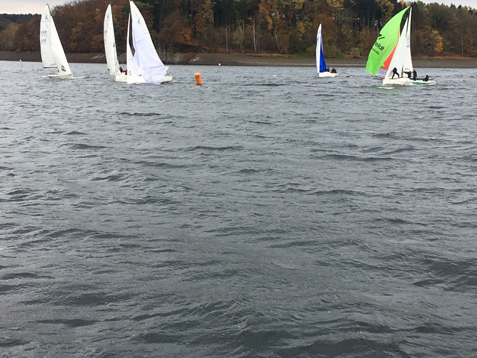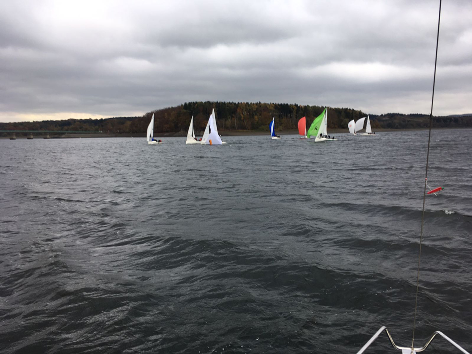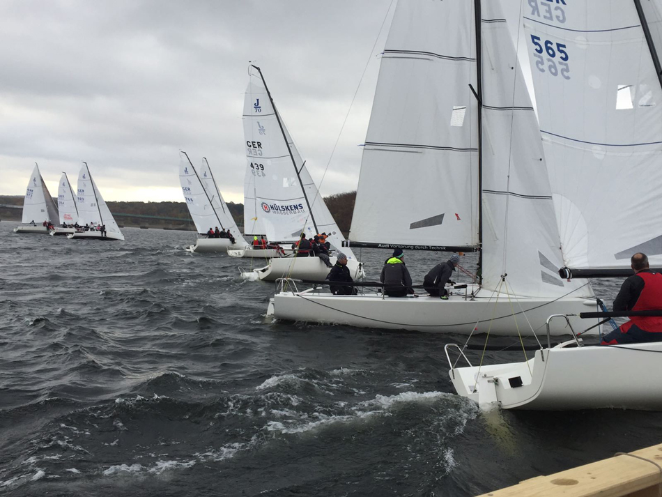 Bei nass-kaltem Wetter, aber hervorragenden Windverhältnissen wurden insgesamt 3 Wettfahrten bei den 505ern und sogar 8 bei den J70 gestartet. Bei den teils sehr engen Rennen gab es viele schöne Bilder und spannende Zweikämpfe zu sehen. Abends gab es erst als Stärkung Grünkohl mit Bratkartoffeln, Mettwurst und Kasseler, bevor ein gecharterter Bus alle Teilnehmer zur Kirmes gebracht hat. Dort wurde vor allem den auswärtigen Seglern anhand von (zahlreichen) Kostproben gezeigt, wie groß die Vielfalt der traditionellen Kirmesgetränke ist. Da der Bus „schon“ um 23 Uhr wieder zurückfuhr, kamen die meisten Segler auch am Sonntag mit hervorragenden Bedingungen bei Winden von 15-20 Knoten zurecht.
